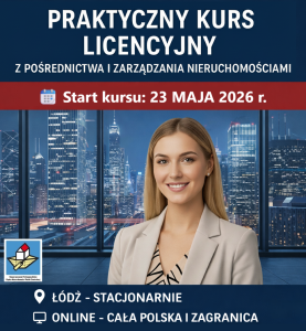 Kurs licencyjny dla pośredników i zarządców nieruchomości – 23 maja 2026. 23 maja 2026 – rozpoczynamy już 71 edycję praktycznego, zawodowego kursu licencyjnego z pośrednictwa